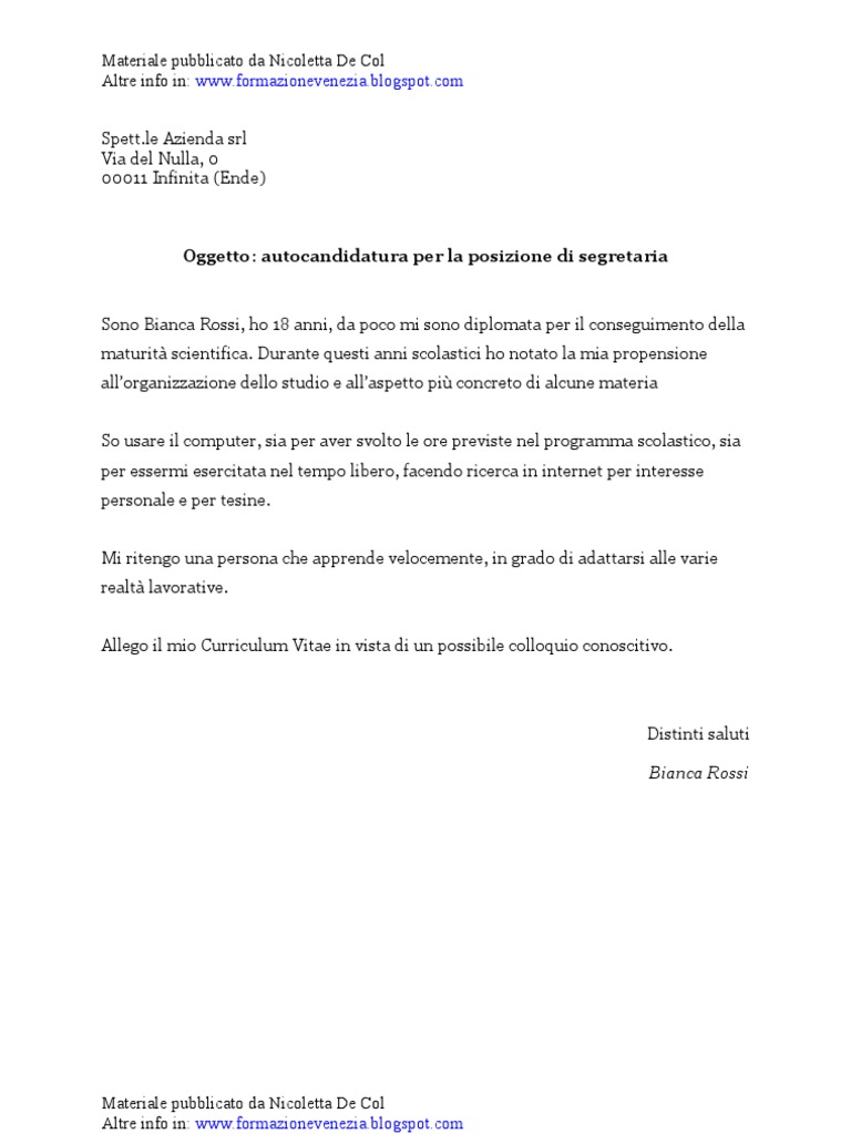 Esempio di lettera di presentazione Chiara Bianchi Via dellArtigianato 57 30172 Venezia Mestre tel. Le lettere di presentazione variano in base a se si sta inviando unauto-candidatura o se si sta rispondendo ad unofferta di lavoro.